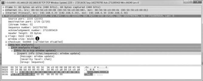 本例中,窗口大小增加到一個(gè)非常健康的數(shù)值64,240字節(jié)①。Wireshark再次在SEQ/ACK Analysis告訴我們這是一個(gè)窗口更新。