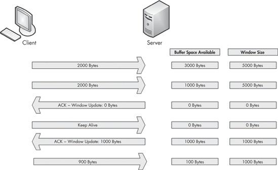 服務(wù)器初始接收數(shù)據(jù)窗口為5000字節(jié)大小。從客戶(hù)端接收4000字節(jié)數(shù)據(jù)之后,服務(wù)器負(fù)載變得非常繁重,無(wú)法繼續(xù)處理客戶(hù)端任何數(shù)據(jù)。服務(wù)器于是發(fā)送窗口大小值為0的報(bào)文。客戶(hù)端暫停數(shù)據(jù)傳輸并發(fā)送一個(gè)探測(cè)報(bào)文。探測(cè)報(bào)文之后,服務(wù)器回復(fù)以告知客戶(hù)端現(xiàn)在可以接收數(shù)據(jù)的報(bào)文,以及窗口大小為1000字節(jié)。客戶(hù)端恢復(fù)傳送數(shù)據(jù)。