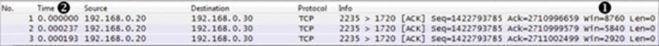 第四個(gè)報(bào)文從192.168.0.20發(fā)送至192.168.0.30,目的是告訴192.168.0.30它不再接收任何數(shù)據(jù)。0值見(jiàn)于TCP報(bào)文頭①,Wireshark的Packet List面板Info欄,以及TCP報(bào)文頭的SEQ/ACK Analysis字段②也告訴我們這是一個(gè)0窗口報(bào)文。