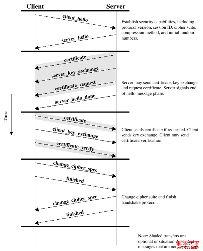 這里重點介紹一下服務端的驗證和密鑰交換。這個階段的前面的(a)證書 和(b)服務器密鑰交換是基于密鑰交換方法的。而在SSL中密鑰交換算法有6種:無效(沒有密鑰交換)、RSA、匿名Diffie-Hellman、暫時Diffie-Hellman、固定Diffie-Hellman、Fortezza。