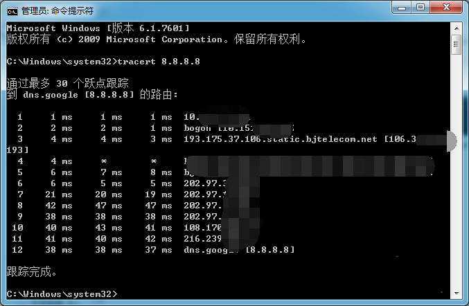 6、點擊回車后,指令自動進行路由跟蹤,并返回跟蹤結果。