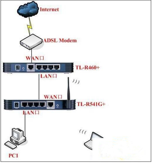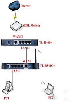 1)寬帶線〈—〉ADSL MODEM〈—〉R460+(LAN口)〈—〉(WAN口)WR541G+(無線)〈—〉電腦