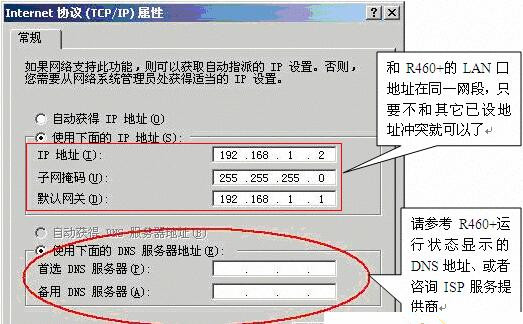 接下來就是通過無線或者有線方式連接WR541G+和電腦,上面兩步配置完以后,WR541G+就相當于一臺“無線交換機”,所以通過有線或者無線方式連接在WR541G+上面的電腦的TCP/IP屬性要和R460+保持一致!就相當于這些電腦是直接連接在R460+ LAN口下面的電腦,電腦的TCP/IP屬性參數配置如下圖所示: