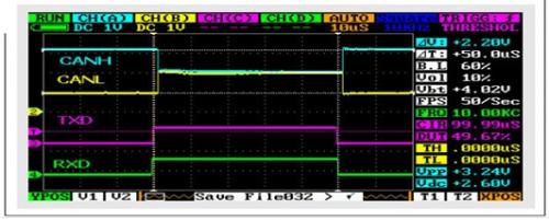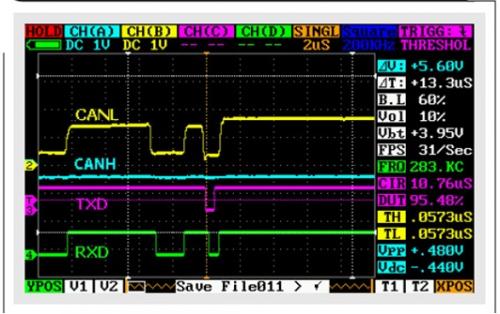 對總線進行調(diào)試時,最為有用的工具之一便是示波器。盡管單通道示波器便可看到信號,但最好還是用雙或者四通道。理想情況下,可同時看到TXD、RXD、CANH和CANL,以確保收發(fā)器和總線性能如預(yù)期。進行初次調(diào)試時,只需一個低帶寬示波器,因為標(biāo)準(zhǔn)CAN被限定在1Mbps。(在不遠(yuǎn)的將來,在引入擁有靈活數(shù)據(jù)速率的CAN以后,這種情況將有所改變。)如果該節(jié)點正發(fā)送數(shù)據(jù)比特流,則可在TXD輸入端看到輸入數(shù)據(jù)。差分CAN總線引腳(CANH/CANL)存在傳輸延遲,同時還存在RXD輸出傳輸延遲。在CAN中,這些延遲均為循環(huán)時間,或者說循環(huán)延遲。如果該節(jié)點正在接收,則TXD閑置;但是總線和RXD輸出會顯示CAN幀。