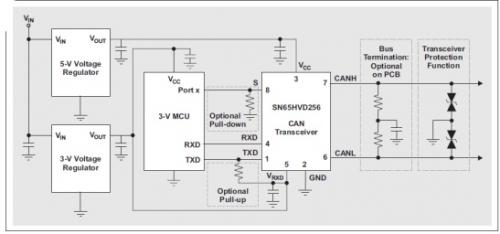 建議本地旁路電容器至少應(yīng)為4.7µF,以確保總線狀態(tài)轉(zhuǎn)換期間有足夠的電源緩沖。否則,收發(fā)器的突入電流可能會引起明顯的電壓電源紋波。我們可以使用一個示波器來驗證電源電壓是穩(wěn)定,還是隨著總線狀態(tài)變化而變化。轉(zhuǎn)換期間,最好不要讓收發(fā)器“饑餓”。收發(fā)器受到其限流的保護,但是,當(dāng)收發(fā)器試圖驅(qū)動總線至顯性狀態(tài)時,如果其中一條總線短路至電源或者接地,則電源電流極高。如果電壓調(diào)節(jié)器無法提供這么多的電流,則電壓電平降至收發(fā)器規(guī)格范圍以下,甚至可能會低至觸發(fā)收發(fā)器的欠壓鎖定狀態(tài)。
