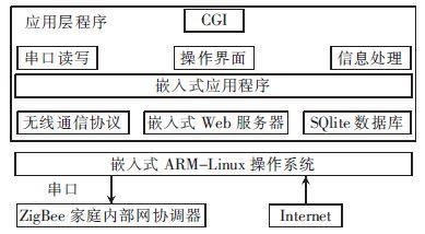 本文設計的家庭網關要處理來自Internet的數據,要求實現家庭網關的硬件必須提供強大的網絡支持,同時需要支持TCP/IP協議,因此需要操作系統來支持多任務。家庭網關是一個由硬件和軟件共同組成的功能實體,將Boa服務器移植到ARM開發板作為網關使用。Boa是一個單任務的小型HTTP服務器,源代碼開放、性能優越,特別適合應用在嵌入式系統中,家庭網關結構圖如圖2所示。