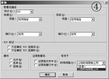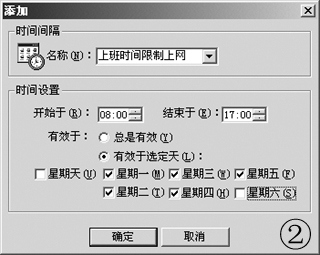 備注:添加第4條時時,別忘了在“時間間隔”中選擇“上班時間限制上網(wǎng)”(圖4)。對于第7條的操作類似。