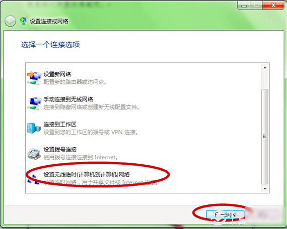 第三步:在界面中,滑動條拉到最底部,選擇“設置無線臨時網絡”,再點擊“下一步”,如下圖。