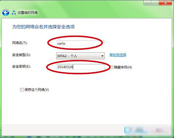 第五步:在“設置臨時網絡”界面,輸入網絡名和安全密鑰,注意由于寬帶的密碼是八位數,所以“臨時網絡”的密碼也是八位數,完成再點擊“下一步”。
