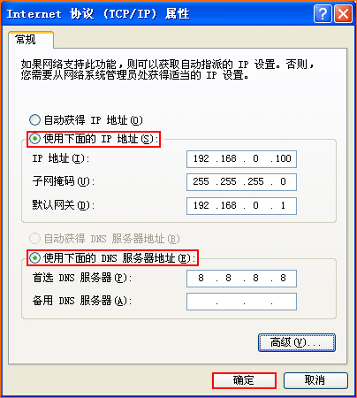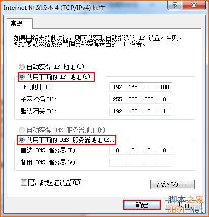 第五步:選擇“使用下面的IP地址”,“使用下面的DNS服務器地址”,確定即可
