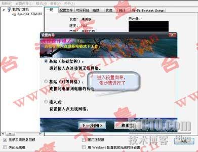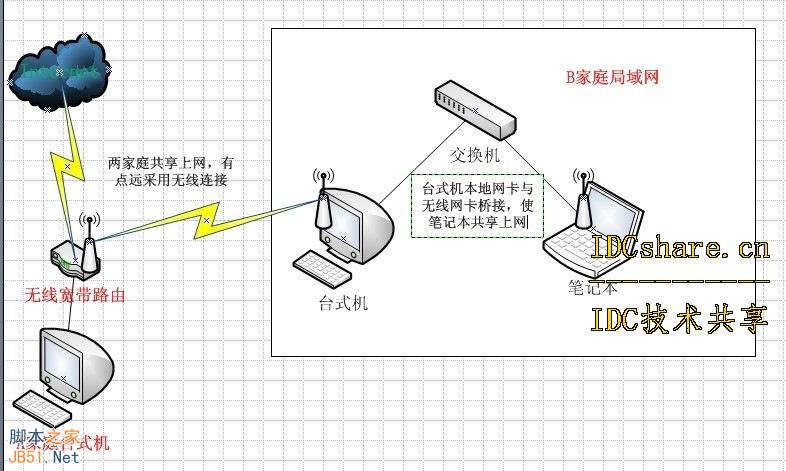 實驗目的:由于AB兩家隔的有遠,筆記本自帶無線網卡信號不是很好,搜索不到信號.只能通過B家臺式機讓筆記本能上網