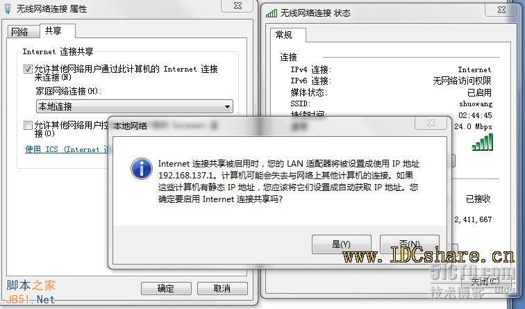接下來跳出來一個窗口,點確定.表示開啟Internet連接共享,無線網ip被設置成192.168.137.1