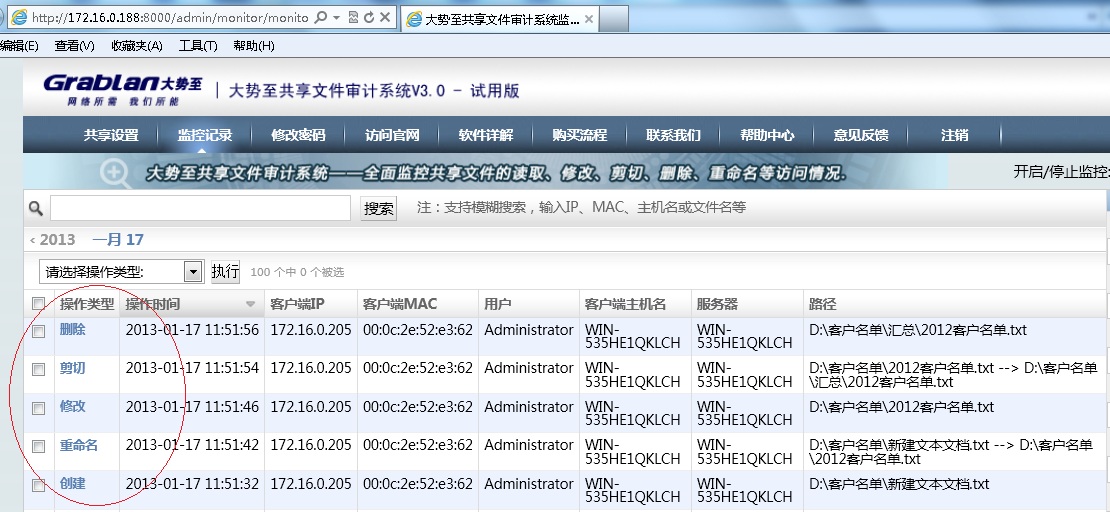 設置完共享之后,如何監控局域網用戶對共享文件的操作記錄呢,畢竟很多共享文件都是單位的重要文件,甚至是商業機密。因此,小編在這里推薦一款專門的服務器共享文件訪問控制軟件——“大勢 至共享文件審計系統”(下載地址:http://www.grablan.com/gongxiangwenjianshenji.html),通過將“大勢至共享文件審計系統”安裝在局域網的服務器上,就可以詳細記錄局域網用戶對共享文件 的打開、復制、修改、剪切、刪除和重命名等操作行為,還可以禁止刪除共享文件、禁止惡意修改共享文件、禁止復制共享文件到訪問者自己的電腦,從而可以有效保護共享文件的安全,保護單位無形 資產和商業機密。如下圖所示: