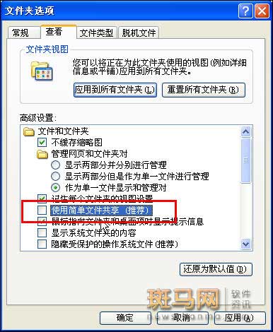 在“文件夾選項”對話框中,如圖11,去除“使用簡單文件共享”選項的選擇。