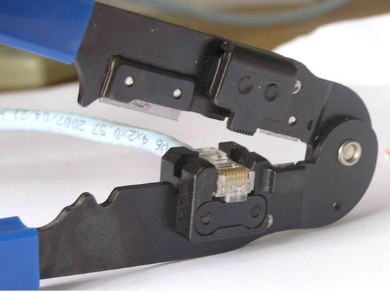 g、 將上面做好的水晶頭放入壓線工具用力壓緊