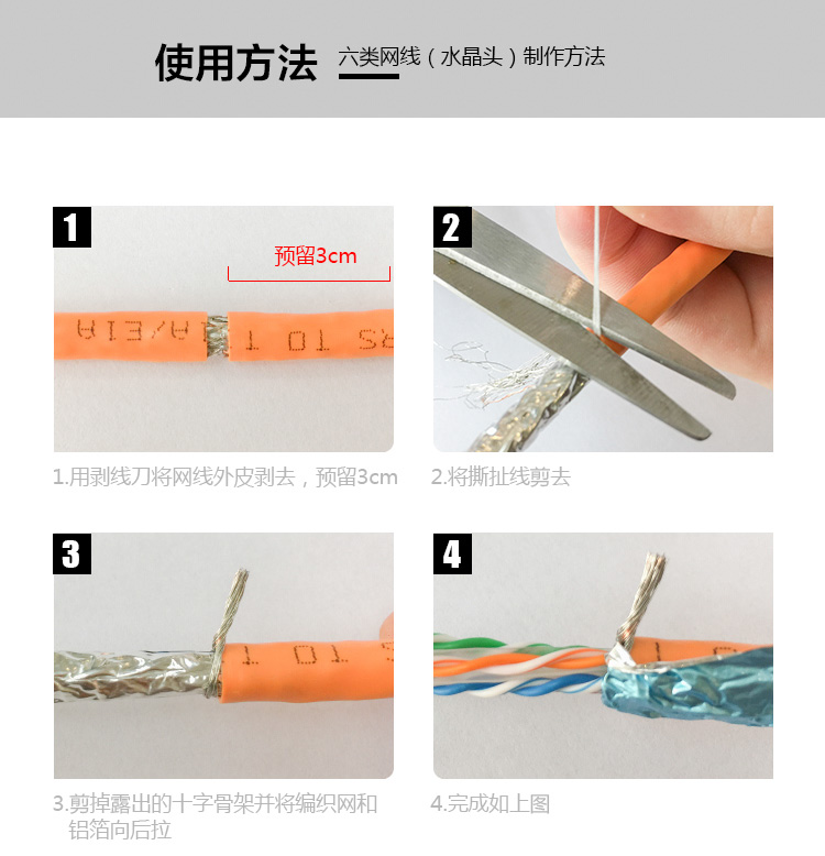 b、 將六類UTP電纜中間的十字骨架剪掉