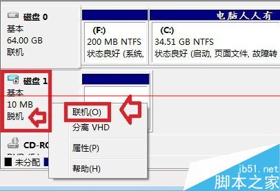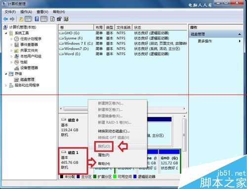 3、右鍵點擊有問題的磁盤(脫機)▶彈出菜單中點擊脫機。