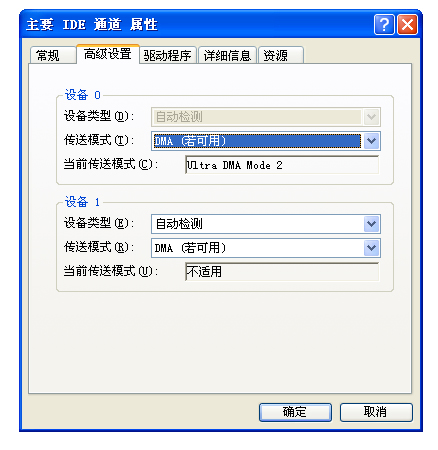 2.在IDE通道屬性窗口中選擇“高級設(shè)置”標(biāo)簽,這時您就能清楚的知道您的DVD刻錄機工作在何種模式下了(ND- 3550工作在Ultra DMA Mode 2模式,也就是DMA33模式,(DMA33模式DMA顯示為2,DMA66為4,DMA100為5、DMA133為6))。