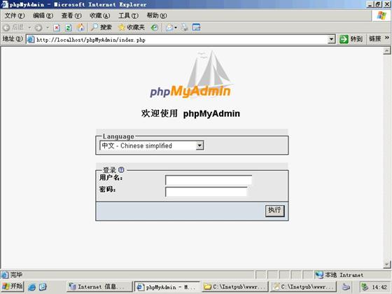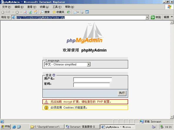 第二個問題b,是因為C:/Inetpub/wwwroot/phpMyAdmin下的config.inc.php配置文件的第177行$cfg['Servers'][$i]['auth_type'] = 'cookie';沒有生效,重啟電腦后就生效了,如果不是cookie,就改為cookie。