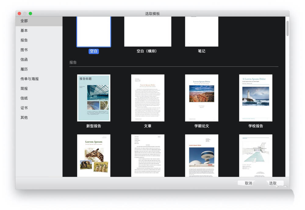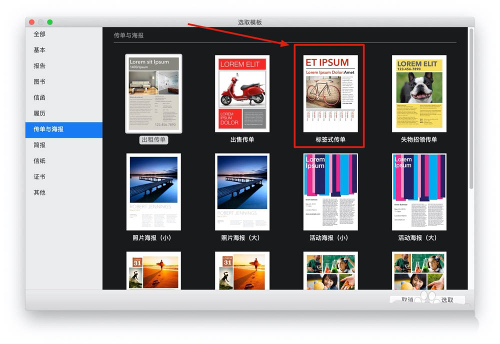 3、這時再選擇Pages文稿左側的『傳單與海報』選項,如圖