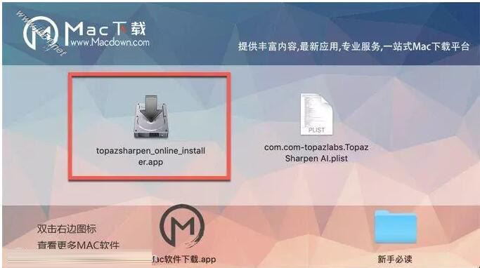 打開“Topaz Sharpen AI Mac破解版”鏡像包,雙擊【Topazsharpen_online_installer】,如圖: