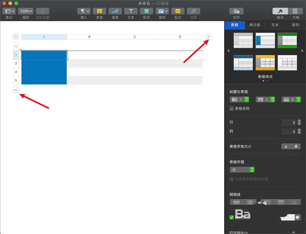4、然后點(diǎn)擊表格兩個(gè)白色的點(diǎn),設(shè)置行跟列,點(diǎn)擊右側(cè)表格,選灰白色。