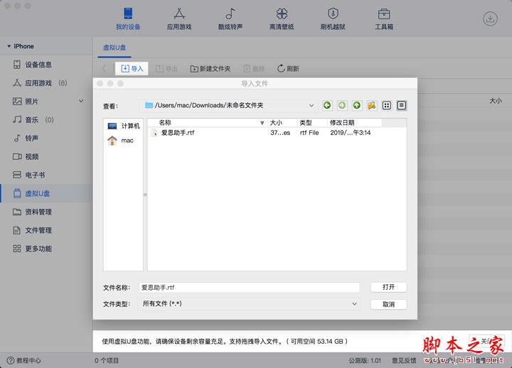 ● 將手機與電腦連接,打開「愛思助手」Mac 版,點選「我的設備」-「虛擬 U 盤」,即可進入「虛擬 U 盤」管理頁面。