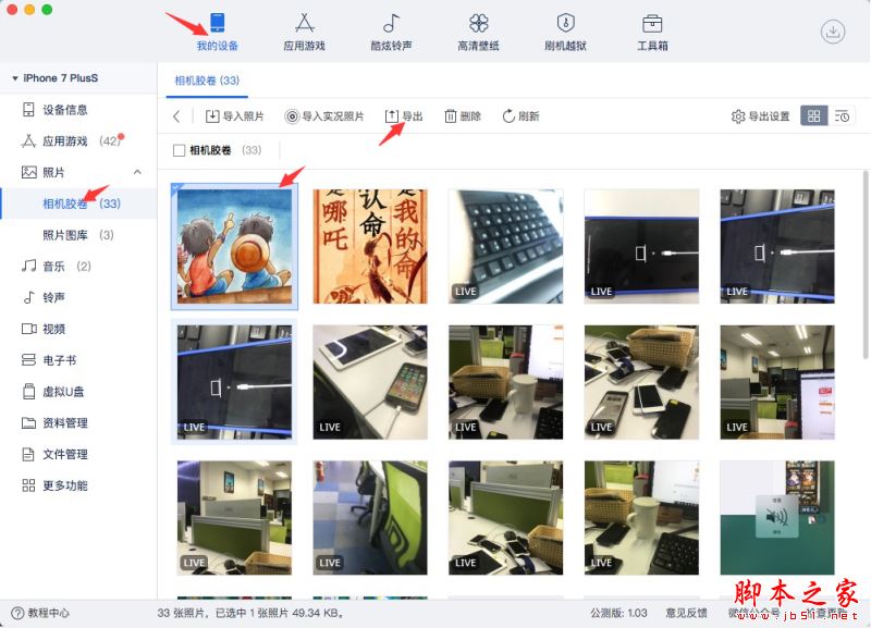 ● 連接另外一臺電腦與手機,打開「愛思助手」Mac 版,前往「虛擬 U 盤」管理頁面,勾選需要導出的問題件,點選「導出」,選擇存放路徑。
