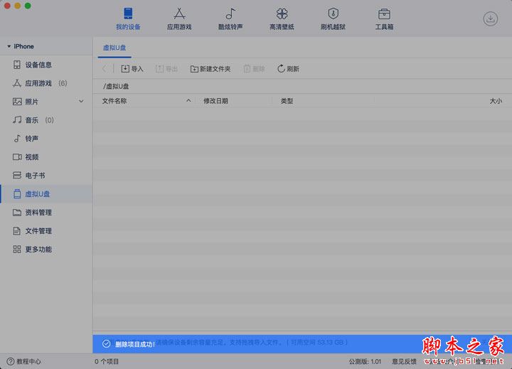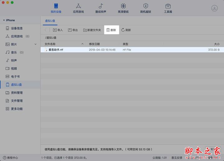 ● 文件傳輸完成后,如需刪除文件可在連接手機與電腦后,打開「愛思助手」Mac 版,前往「虛擬 U 盤」管理頁面,選擇文件后,點按「刪除」。