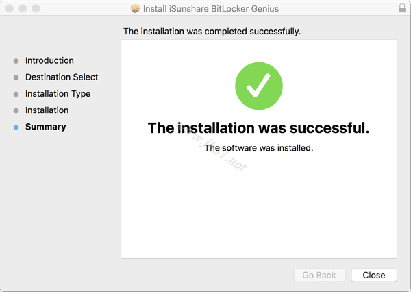 3.等待幾秒鐘,它將完成安裝iSunshare BitLocker Genius到您的mac。單擊Close退出安裝窗口。