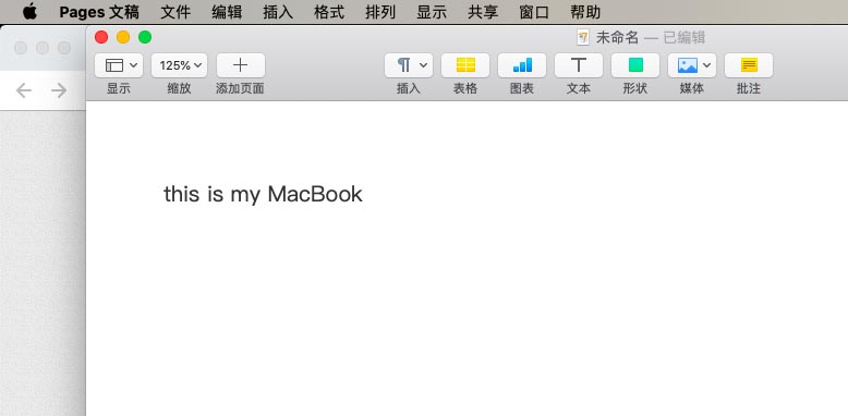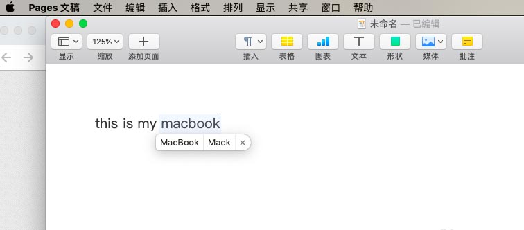 6、輸入完畢之后,pages會檢查出macbook是錯誤的拼寫,正確的拼寫是:MacBook。點擊正確的選項,這個單詞會自動更正為爭取的選項。
