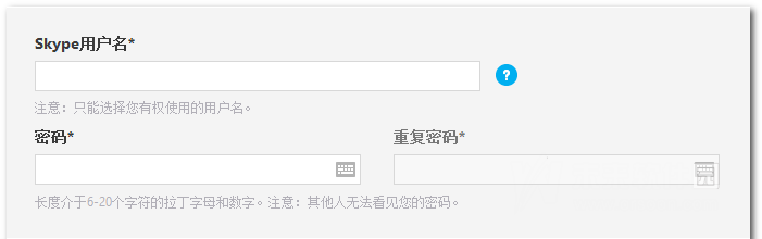 3.輸入skype用戶名。方便好友在skype上通過該用戶名與您取得聯系。輸入skype登錄密碼。密碼區分大小寫,必須是要在6-20個字符之間,其中至少要包含一個字母和一個數字。(溫馨提示:skype用戶名一旦創建不能更改,因此一定要用自己滿意的用戶名。如果您輸入的用戶名已被人占用,請在顯示建議中選擇一項,或嘗試其他名稱。)(如下圖)