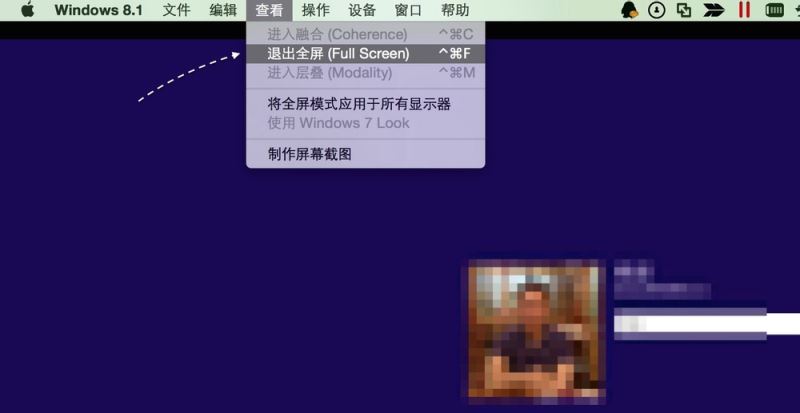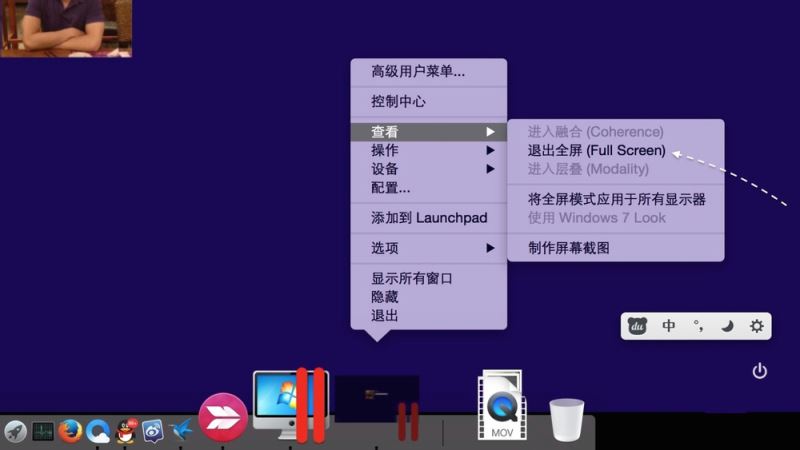 2、當(dāng)我們按下 Ctrl+Alt 組合鍵以后,可以在 Dock 欄上右鍵點(diǎn)擊當(dāng)前正在運(yùn)行的虛擬機(jī),在“查看”菜單中即可看到“退出全屏”選項(xiàng),點(diǎn)擊即可退出。