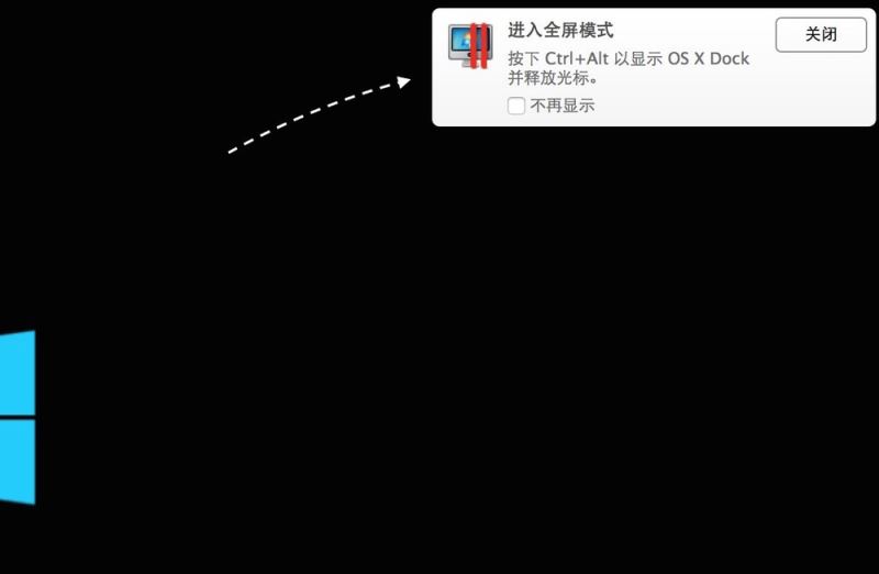 1、之前已經(jīng)說(shuō)到,由于 Parallels Desktop 默認(rèn)是讓虛擬機(jī)啟動(dòng)以后直接進(jìn)入全屏模式,在剛一啟動(dòng)時(shí),可以看到屏幕右上角的提示讓我們按下“Ctrl+Alt”鍵為顯示 Mac OS 下的 Dock 菜單欄。