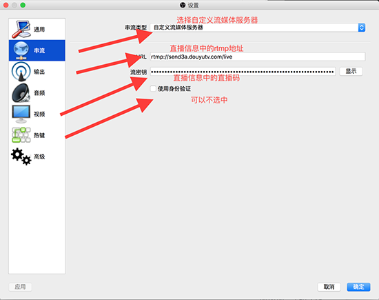 串流類型選擇自定義流媒體服務器,下面的URL和流密鑰需要根據直播間中的直播信息進行填寫,登陸斗魚賬號,點擊用戶名--->個人中心--->主播相關--->直播設置--->進入直播房間,然后可以看到下圖: