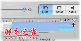 4.iMovie HD 從攝影機擷取了視訊后,會將片段放置于“片段面板”(有很多方格子的地方,這是預設的位置)或時間列(橫跨視窗下方的長軸)中。