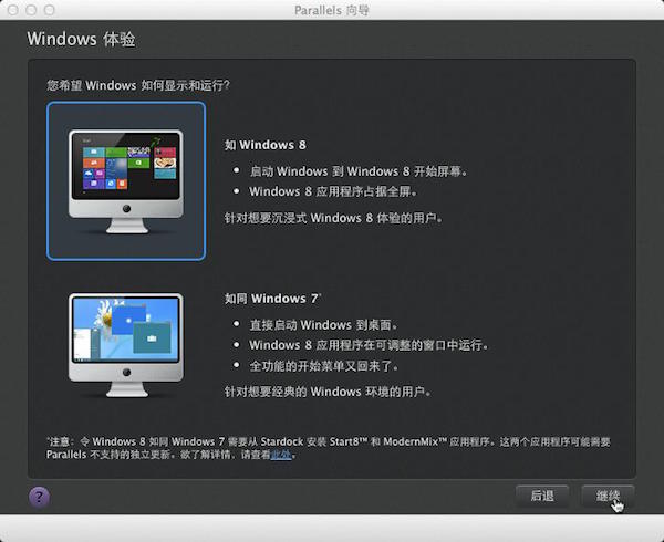 5、由于Windows 8與以往Windows系統用戶界面的差異,這里Parallels Desktop 9會人性化地詢問你“希望Windows如何顯示和運行?”,Parallels Desktop 9提供“Windows 8”和“如同Windows7”兩種運行方式!為了體驗Windows 8的Metro界面,這里選擇第一種界面,也就是將Windows融合到OS中進行安裝,點擊“繼續”進入下一步,上圖2。