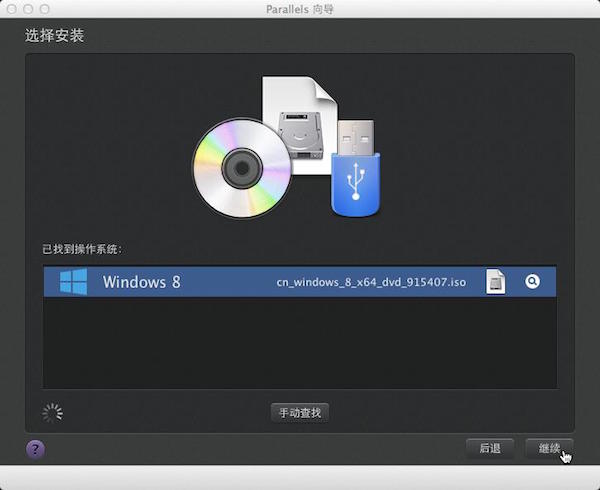 2、Parallels會自動掃描本地存儲的系統安裝文件,在已找到的操作系統中選擇安裝即可。若未找到可通過手動查找”按鈕自定義查找,點擊“繼續”進入下一步:如圖。Parallels Desktop將自動顯示已找到的操作系統,選擇一個進入安裝,這里選擇“安裝Windows 8 64位”。點擊“繼續”進入下一步。