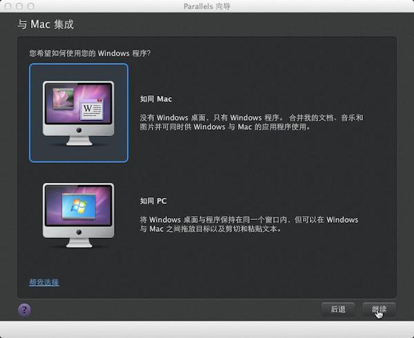 4、相比較Windows下的各類虛擬機,Parallels Desktop提供了前所未有的用戶體驗,安裝時我們可以選擇兩種虛擬機的運行方式:一種是融合到OS(如同Mac),一種則是獨立的Windows界面(如同PC)。當然,安裝結束后在使用過程中,我們也可以隨時切換。這里我們先選擇“如同Mac”選項進行Windows界面安裝,下圖1。
