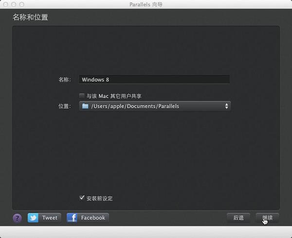 6、接著Parallels Desktop 9會提示我們設置虛擬機系統的名稱和安裝位置(一般情況下選擇默認方式即可),可選擇是否與該Mac上的其他用戶共享。接著點擊“繼續”進行下一步操作。若勾選了“安裝前設定”選項,我們可以根據自己電腦的硬件狀況,進行參數調整,更好的體驗Windows 8系統。當然,Parallels Desktop也可自動根據mac的硬件配置情況來默認推薦較為合理的硬件設定值。