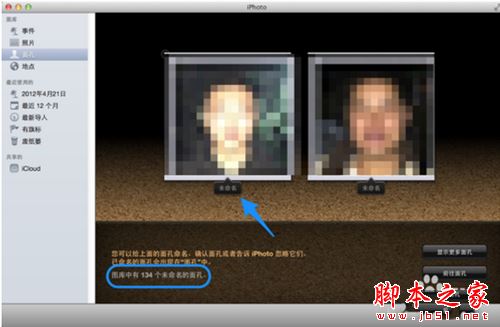 隨后軟件會顯示當前在 iPhoto 的圖庫中,一共有多少張未識別的面孔。在上方會顯示未識別的面孔,會看到面孔下方有一個“未命名”標識