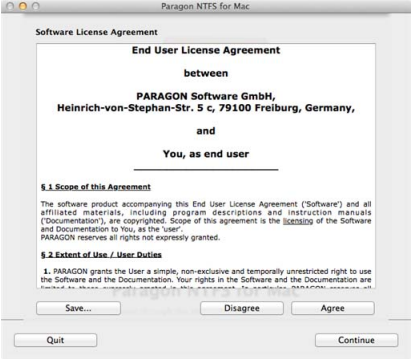 4、 為了繼續(xù)你要接受所有條件中規(guī)定的Paragon的許可協(xié)議,安裝點(diǎn)擊同意按鈕。您還可以保存或打印協(xié)議通過使用適當(dāng)?shù)陌粹o。點(diǎn)擊繼續(xù)的時候。