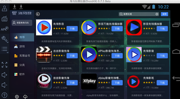 第二步,用戶根據(jù)提示安裝好海馬模擬器Mac版,然后打開該軟件,在海馬玩里面搜索影音先鋒這款軟件,當然了搜索結果會有很多,用戶可以根據(jù)自己的需求進行選擇下載: