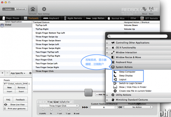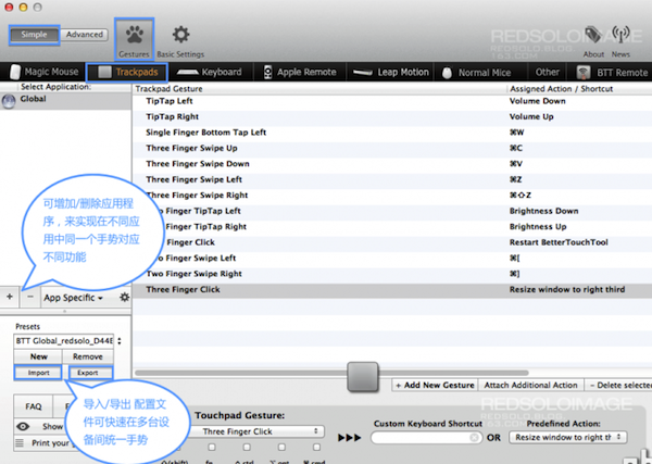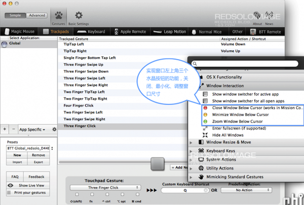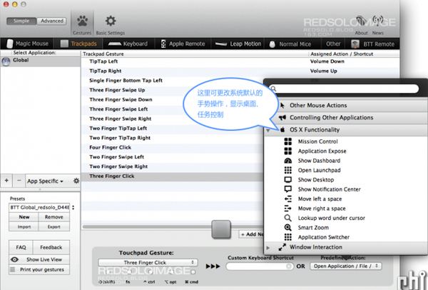 尋覓了很久適合imac的多功能無線鼠標,一無所獲。不經意間看到介紹BetterTouchTool的文章,如獲至寶。os x對觸控板的設置并沒有完全發揮出它的潛力,右手能干的事情還可以更多。BetterTouchTool(簡稱BTT)就是這樣一款軟件,把觸控板的潛力發揮到淋漓盡致。平時使用方面(非游戲),功能上秒殺G700s,即便是20多個功能鍵的G600也望塵莫及。