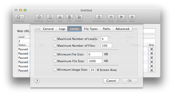你可以定義所扒的層級,最大文件數量,文件最小、最大容量,以及圖片最小尺寸比: