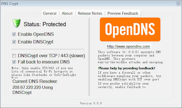 下面以windows版的安裝為例,安裝好后基本不用怎么配置,直接就可以用了,綠燈就表示DNS查詢連接被保護(hù)了。默認(rèn)查詢請(qǐng)求是走UDP的,"DNSCrypt over TCP/443"想選就選,TCP更穩(wěn)定,也更慢。如下圖所示: