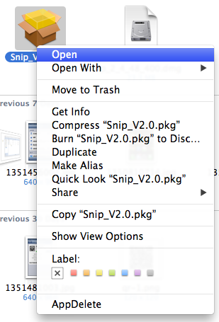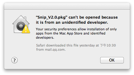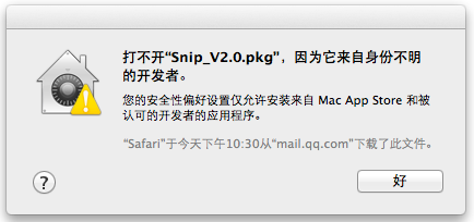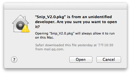 請確認你的操作系統(tǒng)是否為 10.8 或以上版本,是的話請選擇 Snip 安裝包后右鍵單擊,在右鍵菜單中選擇“打開”,便可進行安裝。