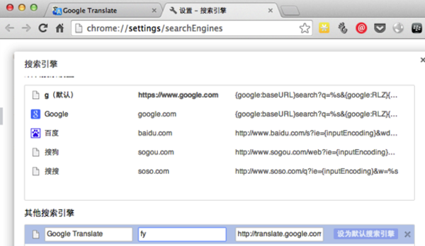 第四步:這時 Chrome 會彈出搜索引擎設置框,找到 Google 翻譯的項目,然后點擊中間的框,在里面輸入你想要的命令,這個命令是你之后使用翻譯功能的口令。