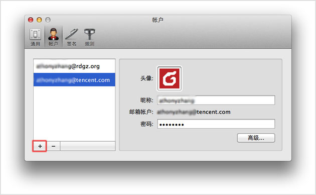 Foxmail for Mac支持同時登錄多個郵箱帳戶,如需添加帳戶,可在偏好設置的“帳戶”標簽頁中點擊“+”按鈕。