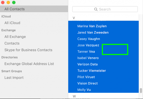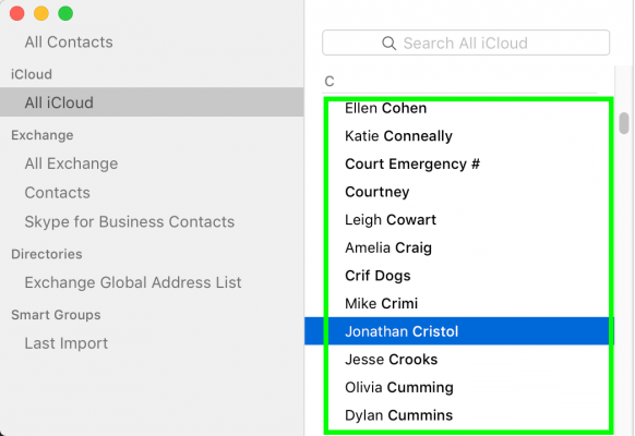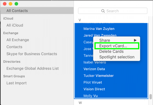 1.打開聯系人并選擇要傳輸的聯系人(Command + A以選擇全部)